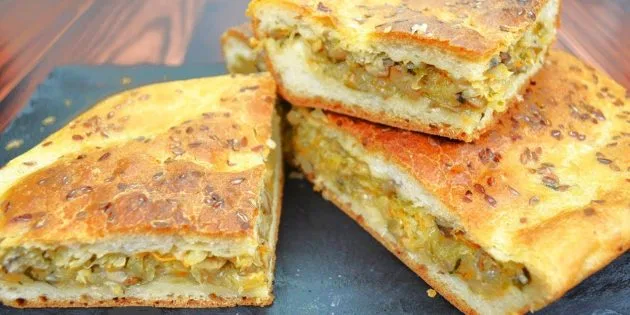 Змішайте борошно, дріжджі, сіль та цукор. Додайте підогріту воду з олією і замісіть тісто. Дайте підійти 20–30 хвилин. Овочі наріжте і обсмажте: спочатку цибулю з морквою, потім додайте капусту і гриби. Змішайте з рубаною зеленню. Викладіть половину тіста у форму, зверху начинку та накрийте другою частиною. Змастіть водою з цукром і посипте насінням. Випікайте 1 годину при 170 °C.