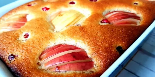 Змішайте рідкі та сухі інгредієнти, вилийте у форму, зверху викладіть яблука. Випікайте при 180 °C 30–40 хвилин.