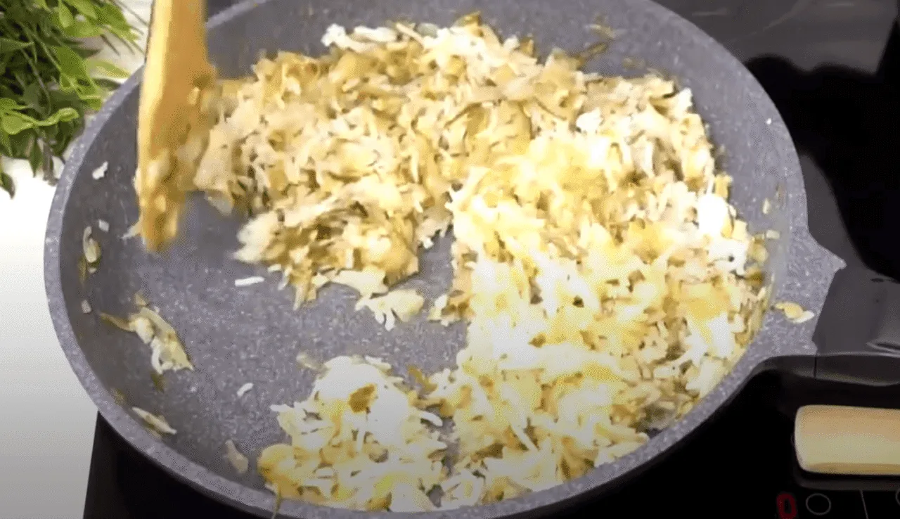 За цей час приготуємо начинку, у мене сьогодні начинка з маринованих огірків та рису. На сковороді обсмажуємо в олії до золотистості дрібно нарізану цибулю. Далі додаємо натерті на великій тертці мариновані огірки, перемішуємо, накриваємо кришкою і тушкуємо до випаровування рідини.