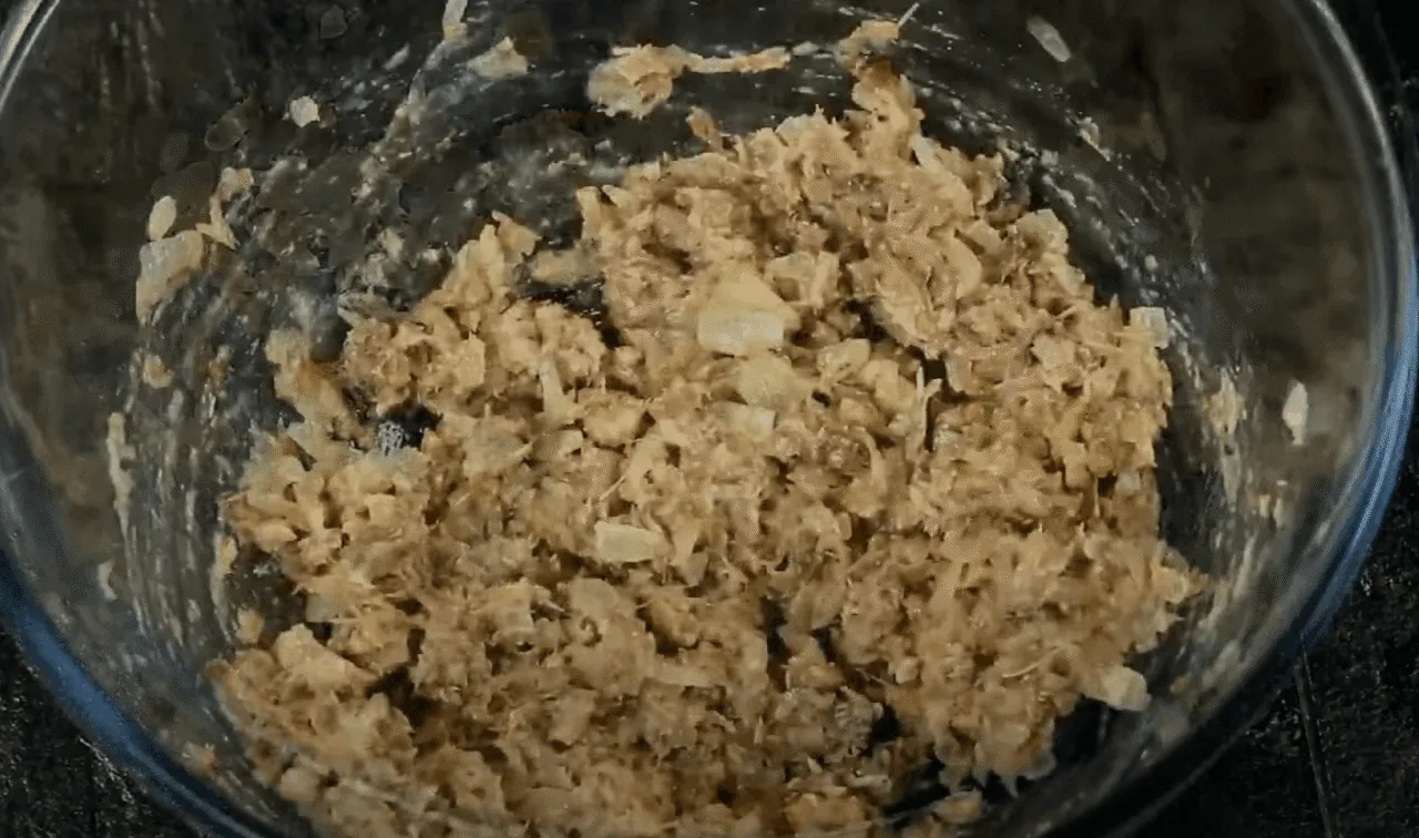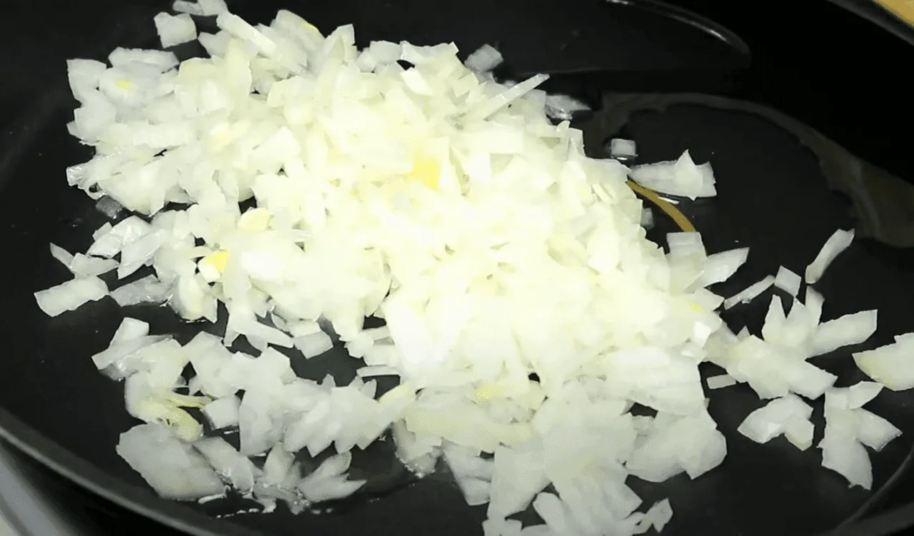 Цибулю нарізаємо на кубики і підсмажуємо на олії до золотистості. Перекладаємо цибулю на паперовий рушник застелений на миску, щоб зійшла олія.