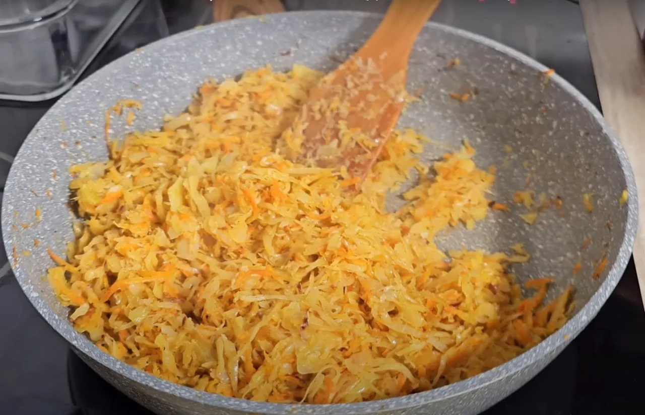 Для капустяної начинки дрібно нарізаємо цибулю, натираємо на великій тертці моркву. У сковороді на олії обсмажуємо цибулю до золотистого кольору.
