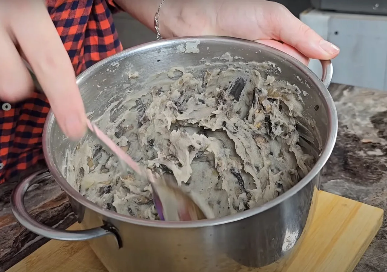 Солимо і перчимо грибну суміш. Картоплю розминаємо в пюре, вливаємо до неї картопляний відвар, перемішуємо та солимо. Змішуємо обсмажені гриби з картопляним пюре.