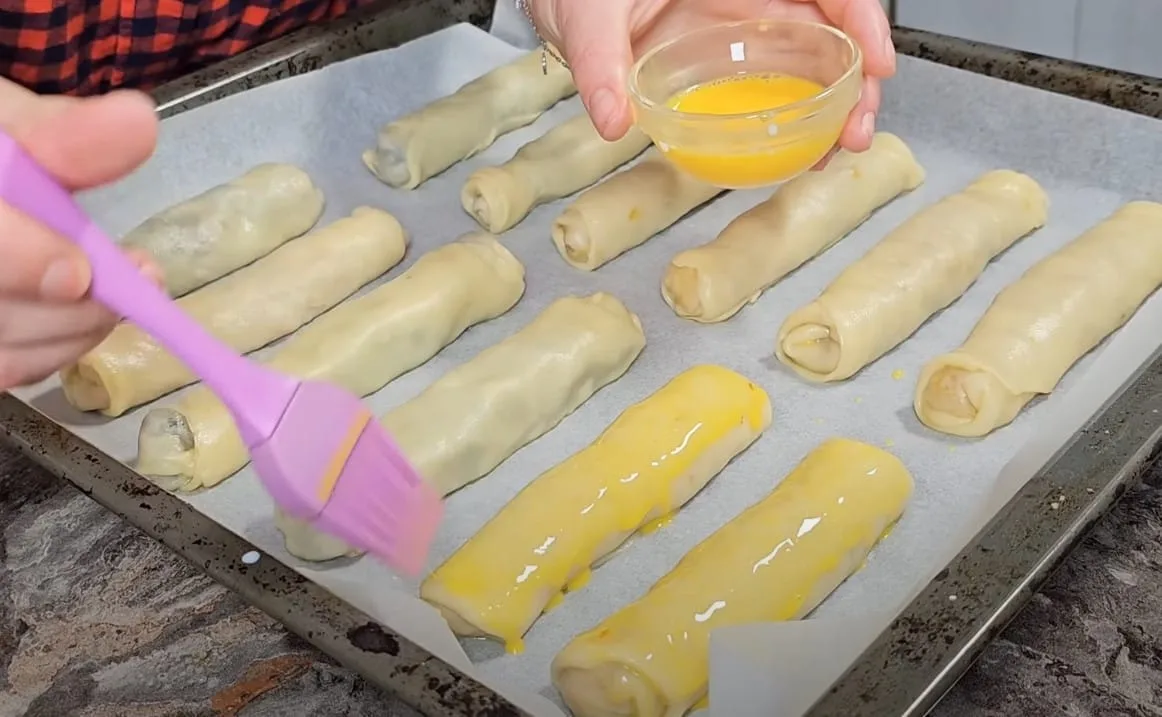 Розкочуємо кожен колобок у дуже тонкі, майже прозорі коржики. Викладаємо на край коржика начинку, згортаємо тісто з начинкою в трубочку.