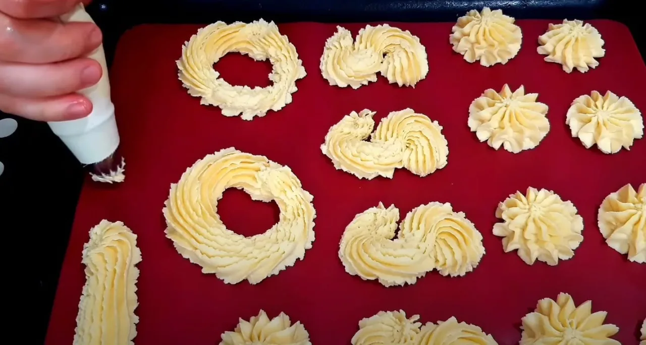 Зціджуємо на деко, застелене пергаментом, трояндочки, смужки та інші фігури з тіста.
