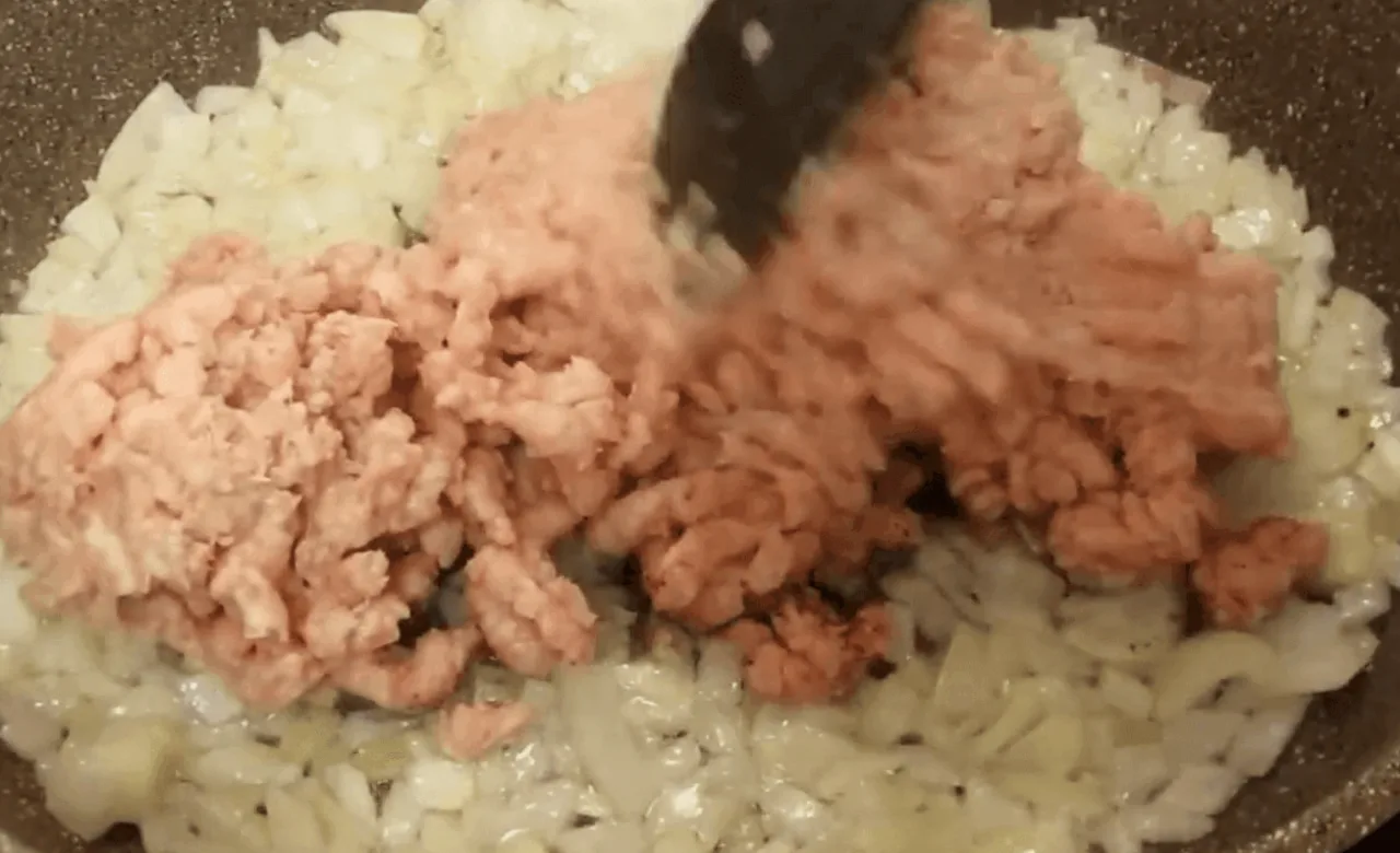 Почну з начинки, вона м’ясна. Беру 600 г фаршу, у мене свинина з куркою. У фарш кладу сіль, перець мелений. На олії обсмажую до прозорості одну велику цибулину, дрібно нарізану. До цибулі додаю фарш і обсмажую їх до готовності.