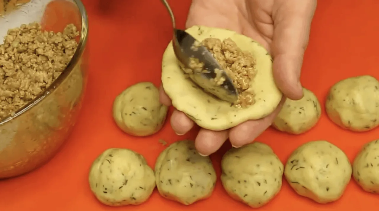 Кожну частину розкочую в джгутик і поділяю на 10-12 частин. Підкочую кожну. Розминаю в коржик, на середину викладаю фарш.