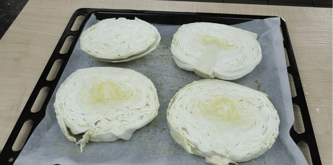 Викладаю капусту. Один шматочок я залишу для супу. Разом у мене виходить 4 шматочки, саме вони і помістилися на деко.