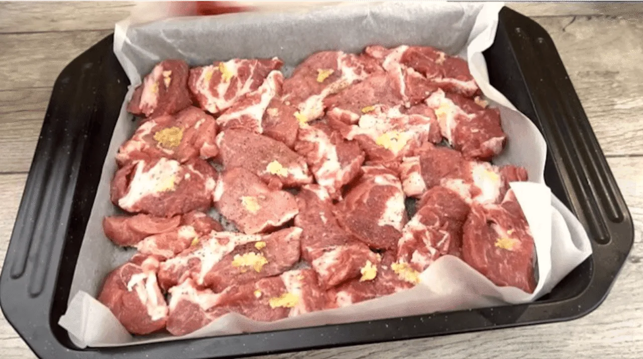 М’ясо, у мене свиняча шия 1 кг, поріжемо на порційні шматочки. Шматочки у мене за розміром приблизно 3 на 4 см.