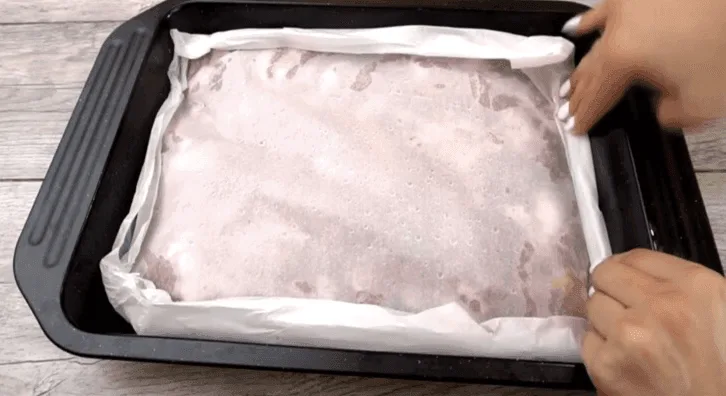 Відріжемо папір для випічки так, щоб можна було покласти у два шари на Ваше деко, кладемо один шар паперу для випічки на деко, змащуємо маслом і кладемо м’ясо.