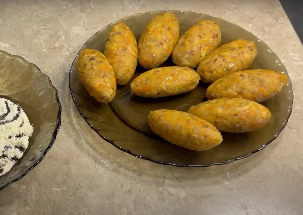 В окрему тарілку висипаємо борошно, обвалюємо у ньому сформовані невеликі котлети.