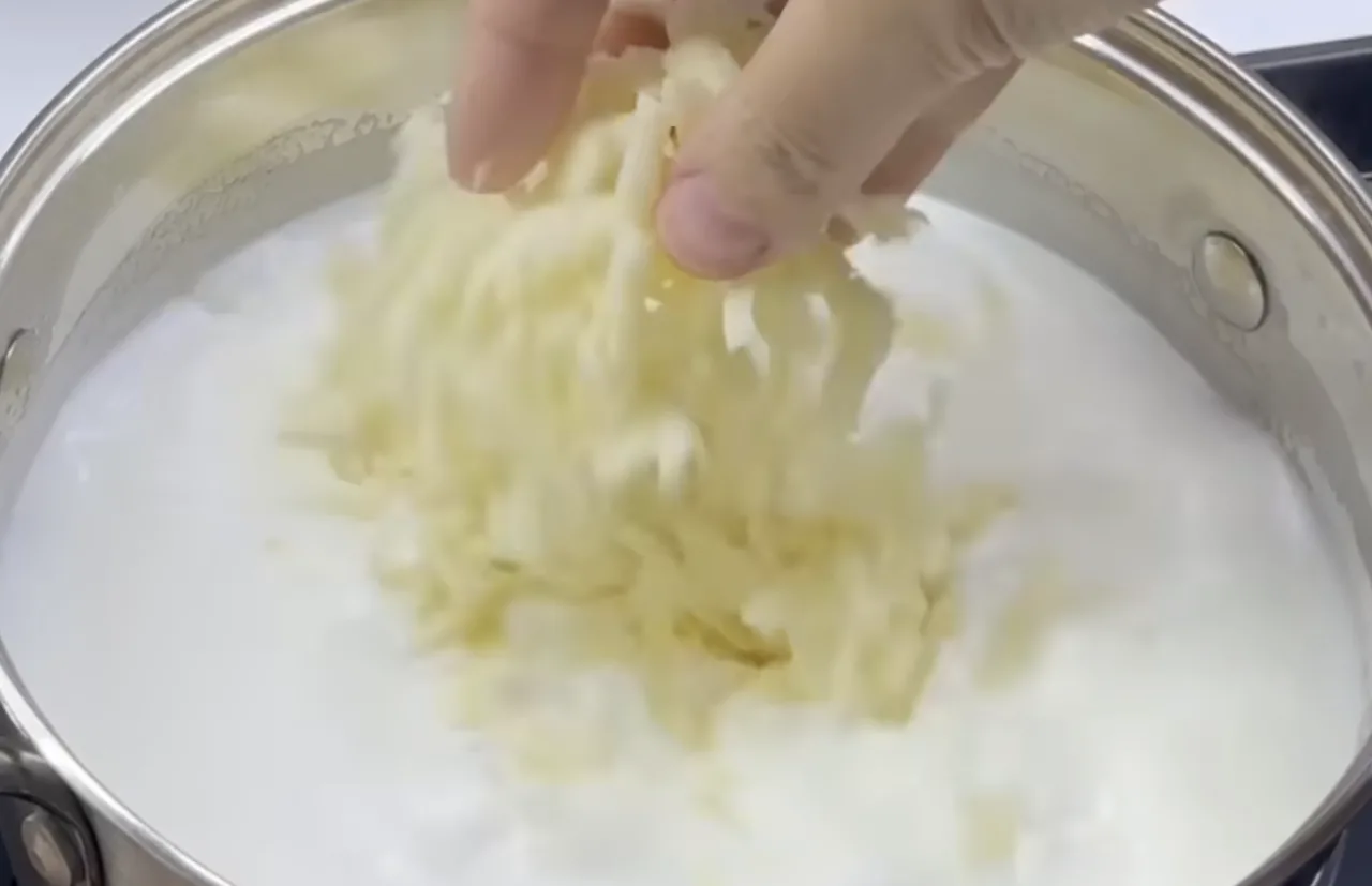 Коли молоко добре нагріється, додайте масло та натертий сир. Постійно помішуйте до густої, однорідної маси.