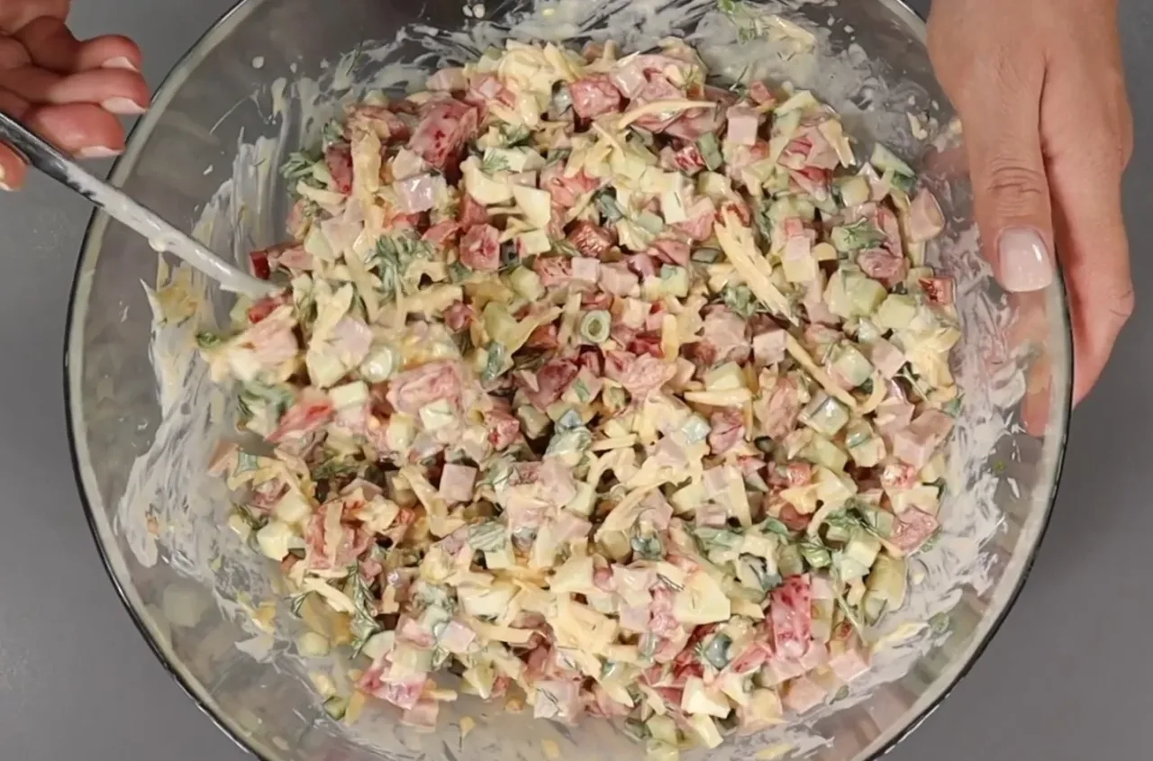 Змішуємо всі інгредієнти в глибокій салатниці та додаємо тертий сир.