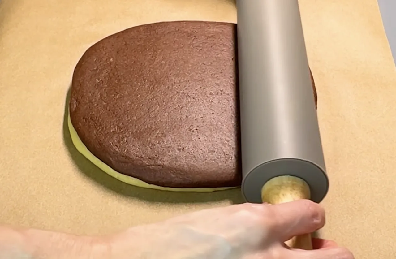 Світле тісто викладаю на пергамент і руками розплющую, зверху викладаю темне тісто і розкатую до тієї ж величини. Повторюю з рештою тіста. Розкочую тісто завтовшки приблизно 1 см, не сильно притискаючи.