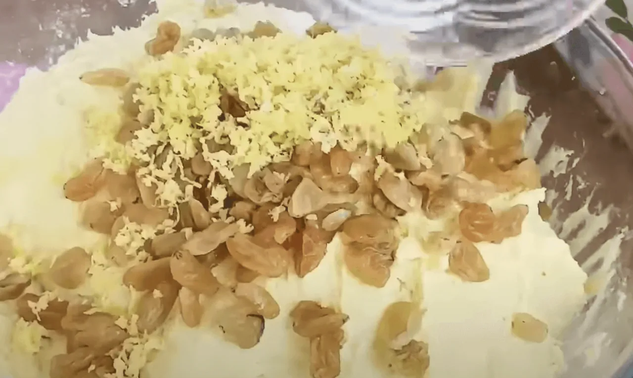 Вводжу м’яке масло, добре вимішую, додаю родзинки, цедру лимона і ложку олії.