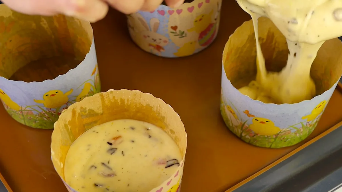 Форми для пасок змащуємо рослинною олією. Викладаємо тісто у форми, заповнюючи приблизно половину або трохи більше. Випікаємо у заздалегідь розігрітій духовці при 180 °C 50–60 хвилин.