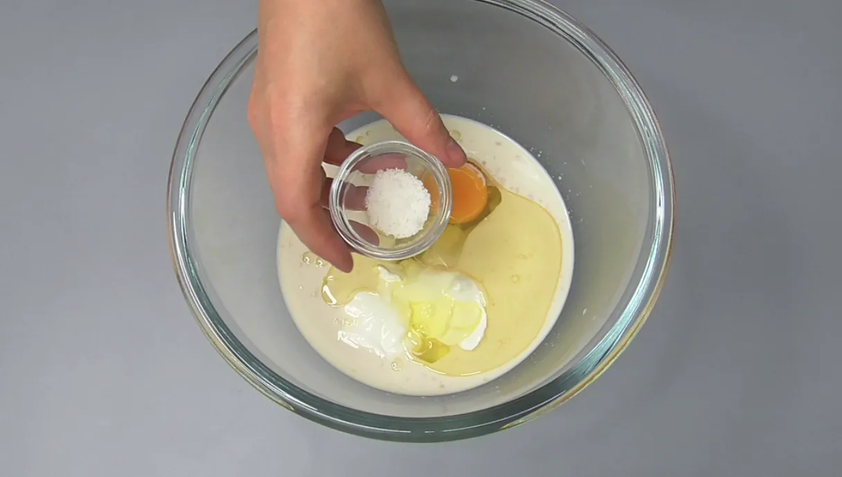 Беру тепле молоко, додаю дріжджі і добре розчиняю їх. Додаю цукор, рослинну олію і сметану. Якщо начинка солодка, цукру кладу менше — орієнтуйтеся на свій смак. Додаю яйце, щіпку солі і ванільний цукор, перемішую до однорідності.