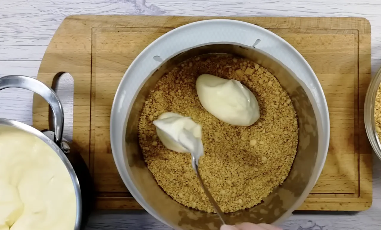 Для крему збиваємо яйця з цукром, додаємо ванільний цукор і крохмаль, розмішуємо без грудочок і додаємо сметану. Ставимо на маленький вогонь і варимо до загустіння, після чого додаємо вершкове масло для насиченого смаку.