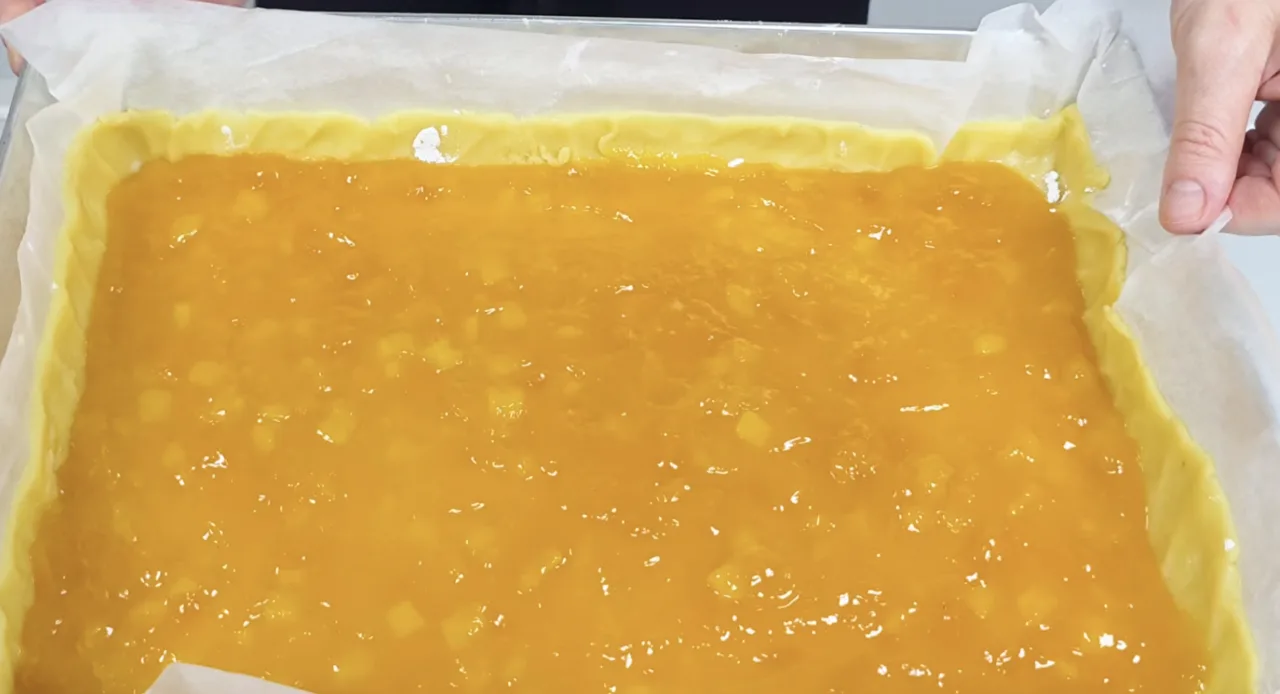 Розкачати пісочне тісто у форму. Викласти джем. Зверху розподілити безе. Посипати подрібненими горіхами.