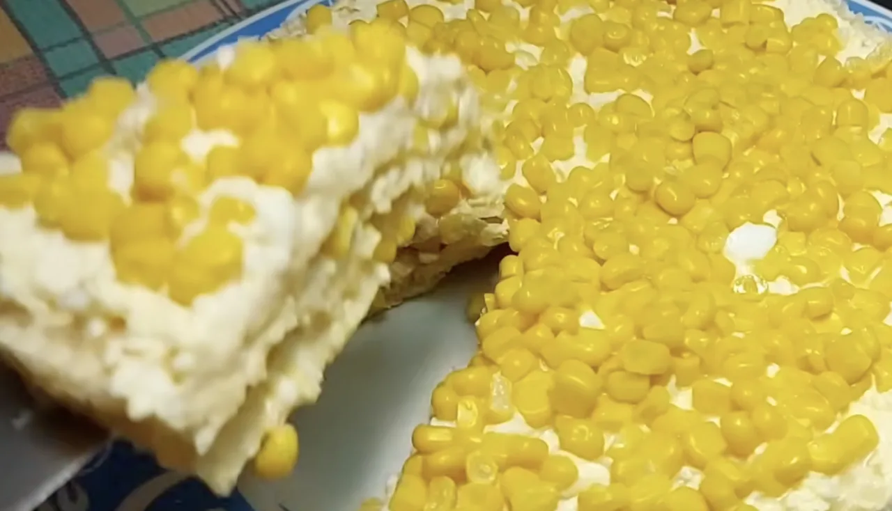 Накриваю вафлею, знову сирна суміш, кукурудза… і так, поки не закінчаться інгредієнти. У мене вийшло три шари.