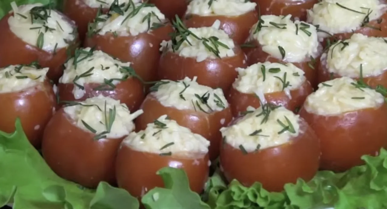 Я змішую сир, часник, сметану і паприку, а потім наповнюю цією масою помідори черрі. Виглядають яскраво і дуже апетитно.