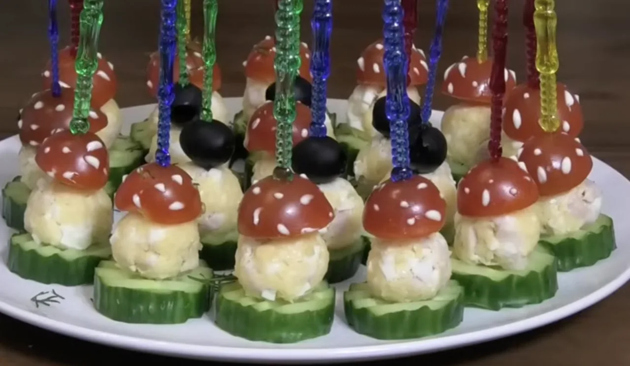 Формую сирні кульки з шинкою та яйцем, викладаю їх на огірки і прикрашаю половинками черрі як «мухомори». Гості завжди фотографують перед тим, як з’їсти.