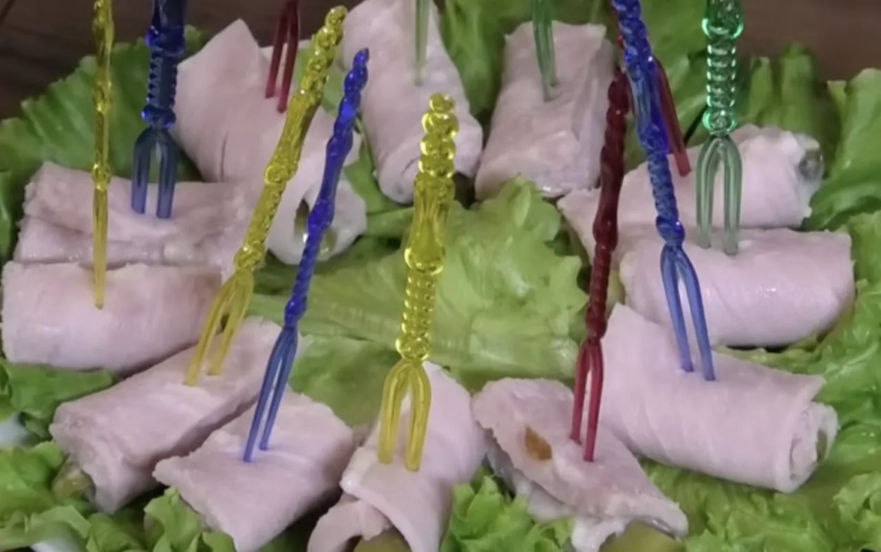 Тонко нарізане м’ясо, трішки хрону і маринований огірочок — скручую рулетиком і закріплюю шпажкою. Просто, але дуже смачно!