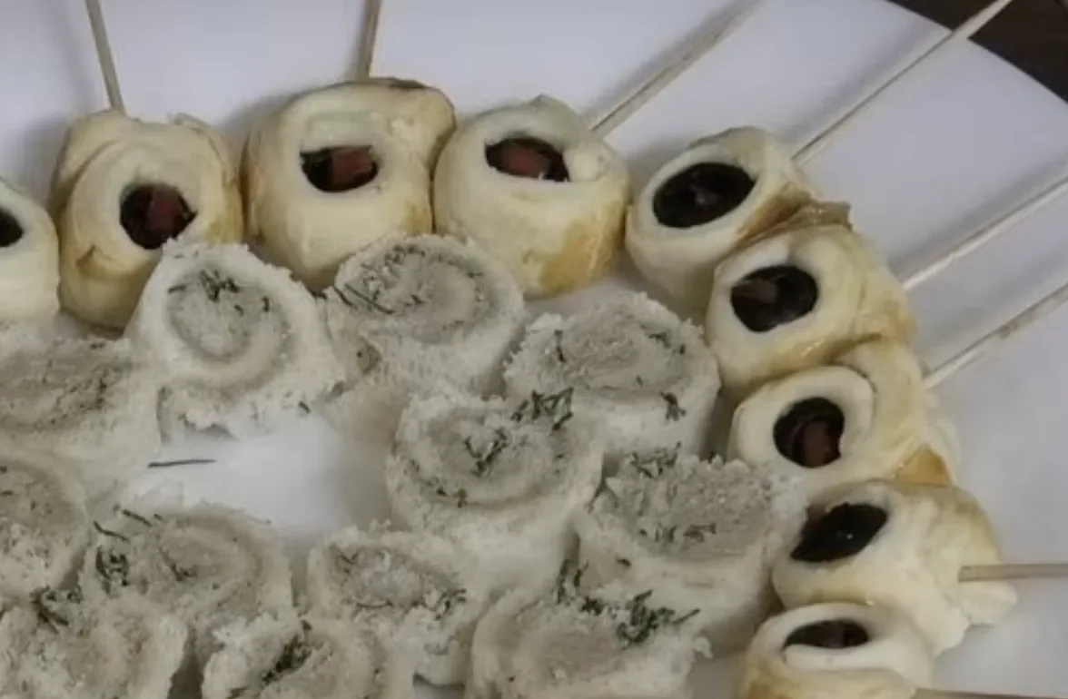 Я беру звичайний білий хліб, розкачую його, намазую паштетом, скручую і нарізаю. Після холодильника вони тримають форму і виглядають дуже акуратно.