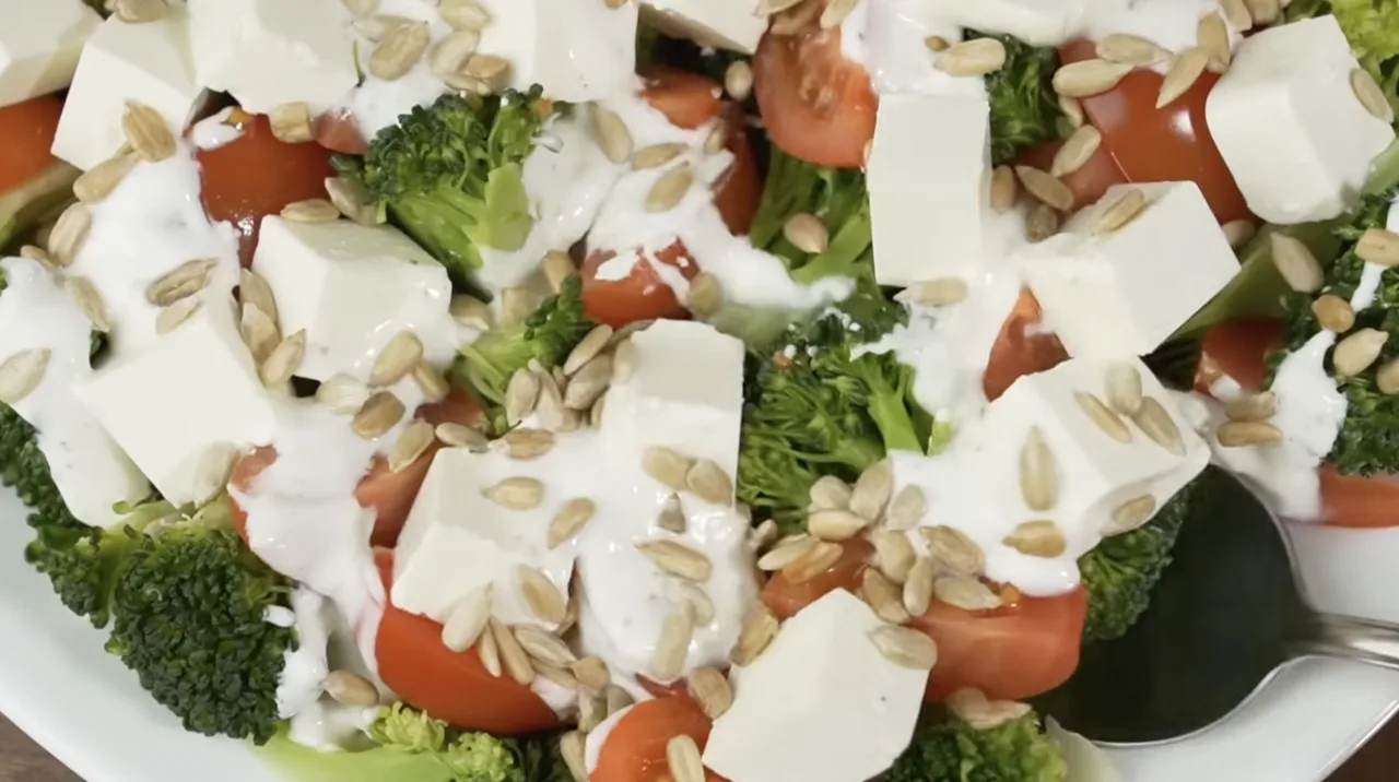 Відварити броколі, додати сир і помідори, полити йогуртовим соусом і посипати насінням.