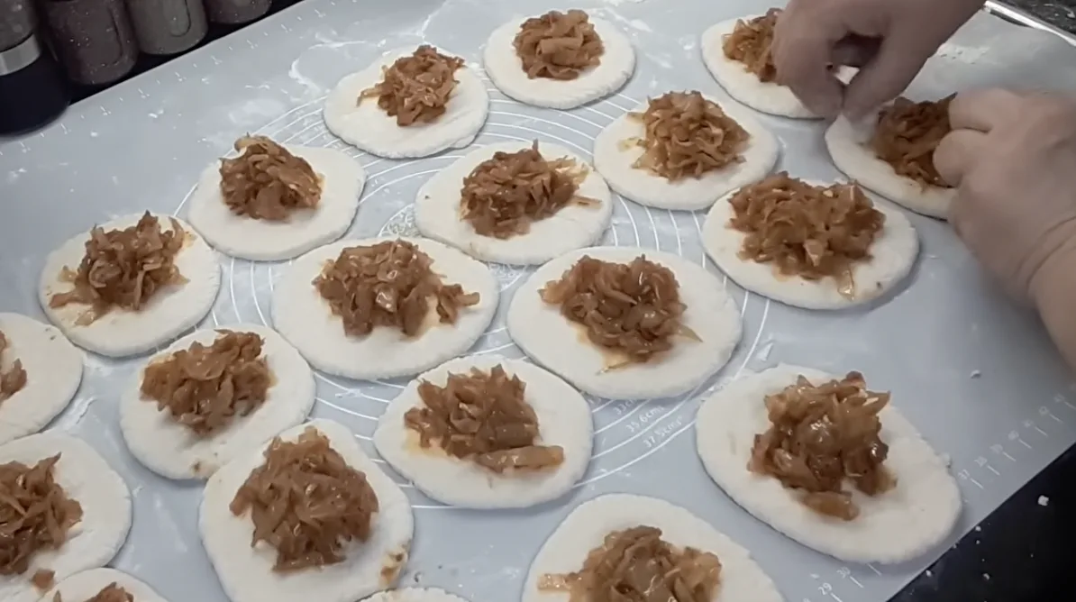 Ділю тісто на шматочки, розкачую, викладаю начинку і ліплю пиріжки.