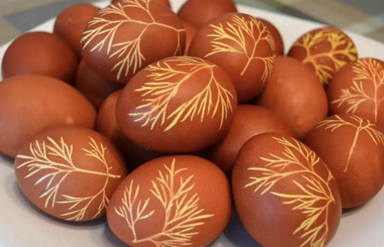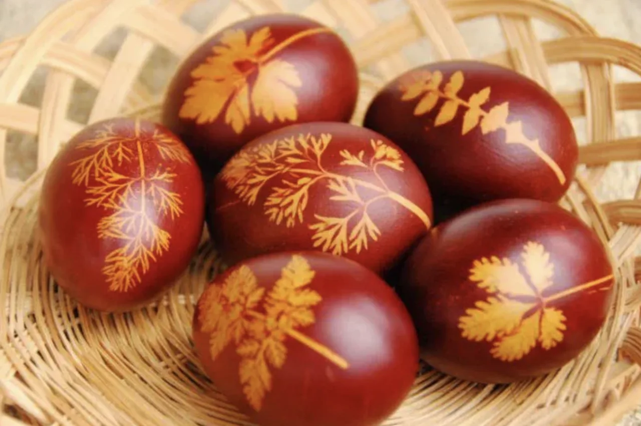 - Рослинні мотиви: прикладаю до яйця маленькі листочки, гілочки петрушки або весняні листочки, потім обгортаю марлею. Відбиток рослини на шкаралупі виходить ніжним і дуже природним.