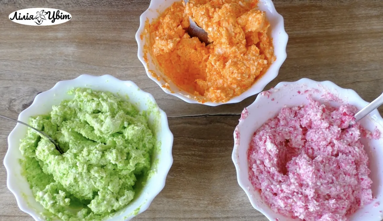 Сир збиваємо з цукром, яйцями та сметаною, додаємо пудинг і цедру лимона, перемішуємо до однорідності. Потім відділяємо по 3 столові ложки у три мисочки та додаємо у кожну різнокольорову кокосову стружку – залишаємо на 10–20 хвилин, щоб стружка набрякла.