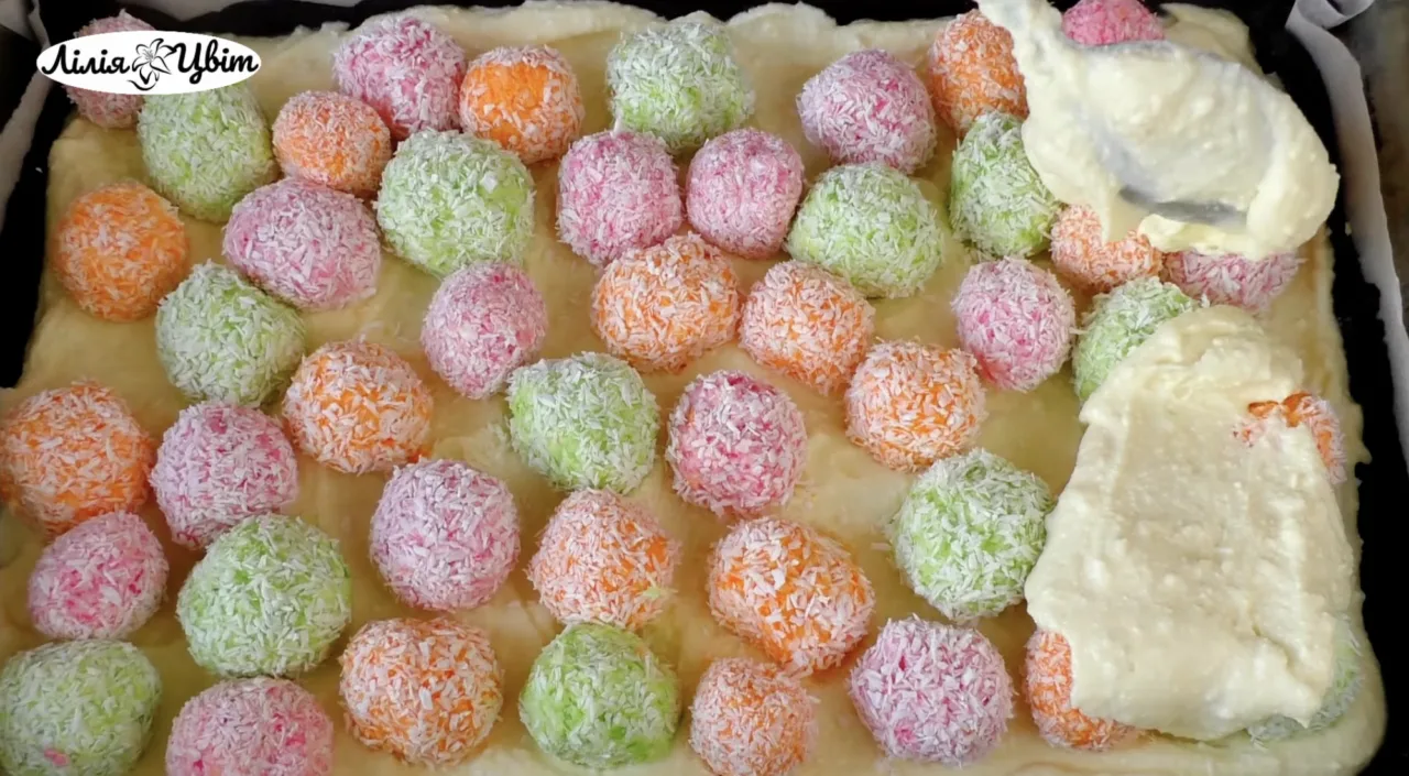 Результат – святковий пляцок із ніжною сирною масою і кольоровими кокосовими кульками, який точно стане родзинкою вашого Великоднього столу.