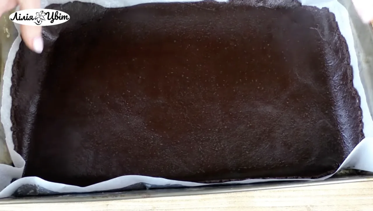Для тіста яйця з цукром і розтопленим маслом збиваємо до однорідності, додаємо борошно, какао і замішуємо м’яке, еластичне тісто. Третину тіста відправляємо в морозилку, а решту розкачуємо по пергаменту за розміром форми (25×35 см), перекладаємо у форму та формуємо бортики.
