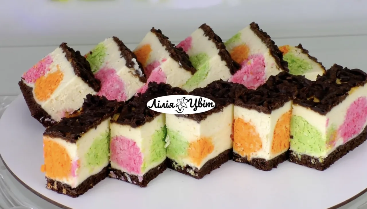 Викладаємо половину сирної маси на шоколадний корж. З кольорового тіста формуємо кульки діаметром приблизно 2 см і викладаємо їх у довільному порядку на сир. Обережно накладаємо решту сирної маси, заповнюючи проміжки між кульками та акуратно розрівнюємо. Зверху натираємо тісто з морозилки.