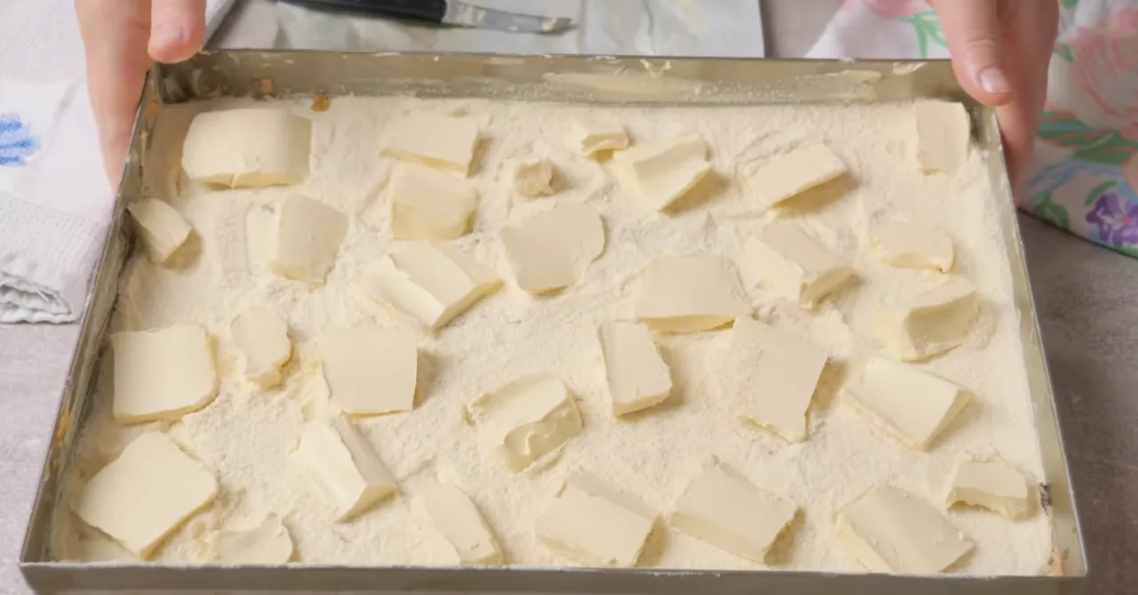 Далі – горіхова начинка, після неї залишок сухих інгредієнтів. Зверху нарізаємо маргарин або масло та викладаємо рівномірно.