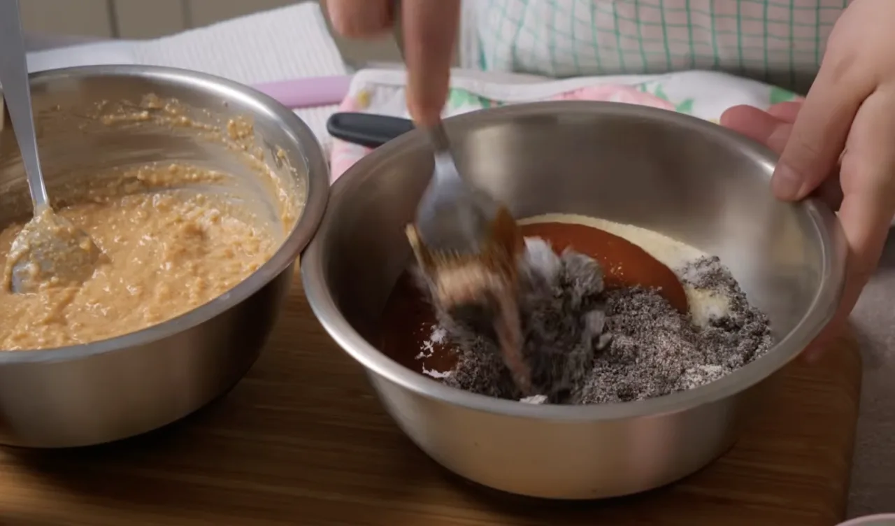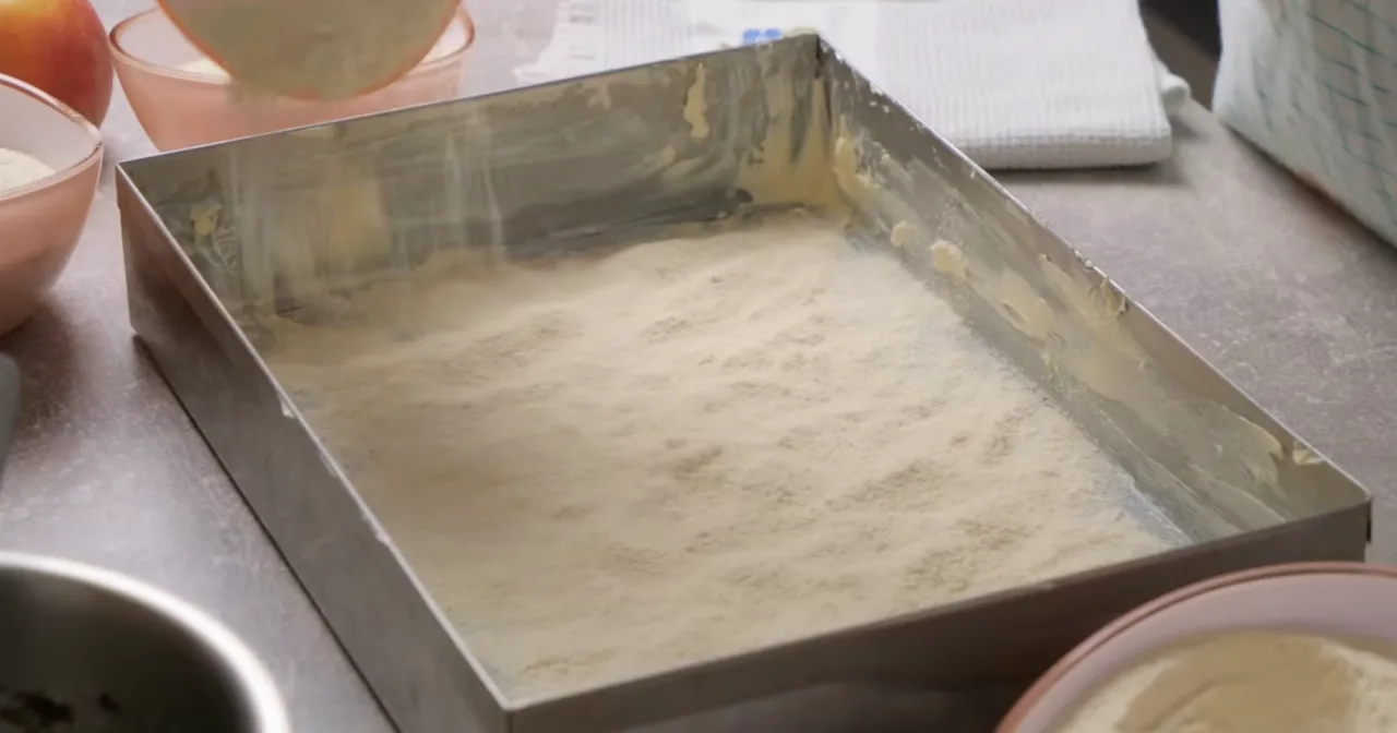 Форму (35×25 см) змащуємо маслом. Четвертину сухих інгредієнтів висипаємо на дно форми.