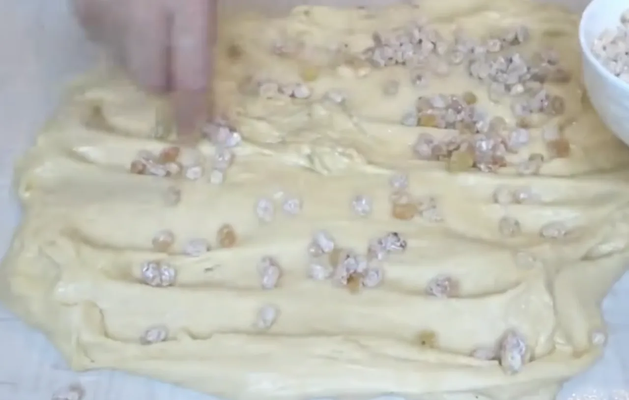 Замочені і просушені родзинки обваляти в ложці борошна і додати в тісто. Тісто залишити в теплому місці на 1,5–2 години.