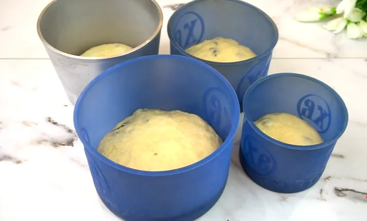 Коли тісто збільшиться вдвічі, обминаємо його й розкладаємо по формах, заповнюючи їх на 1/3.
