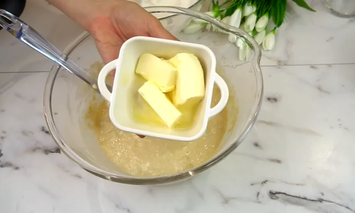 Додаємо 100 г м’якого вершкового масла (можна трохи розтопити в мікрохвильовці), перемішуємо.