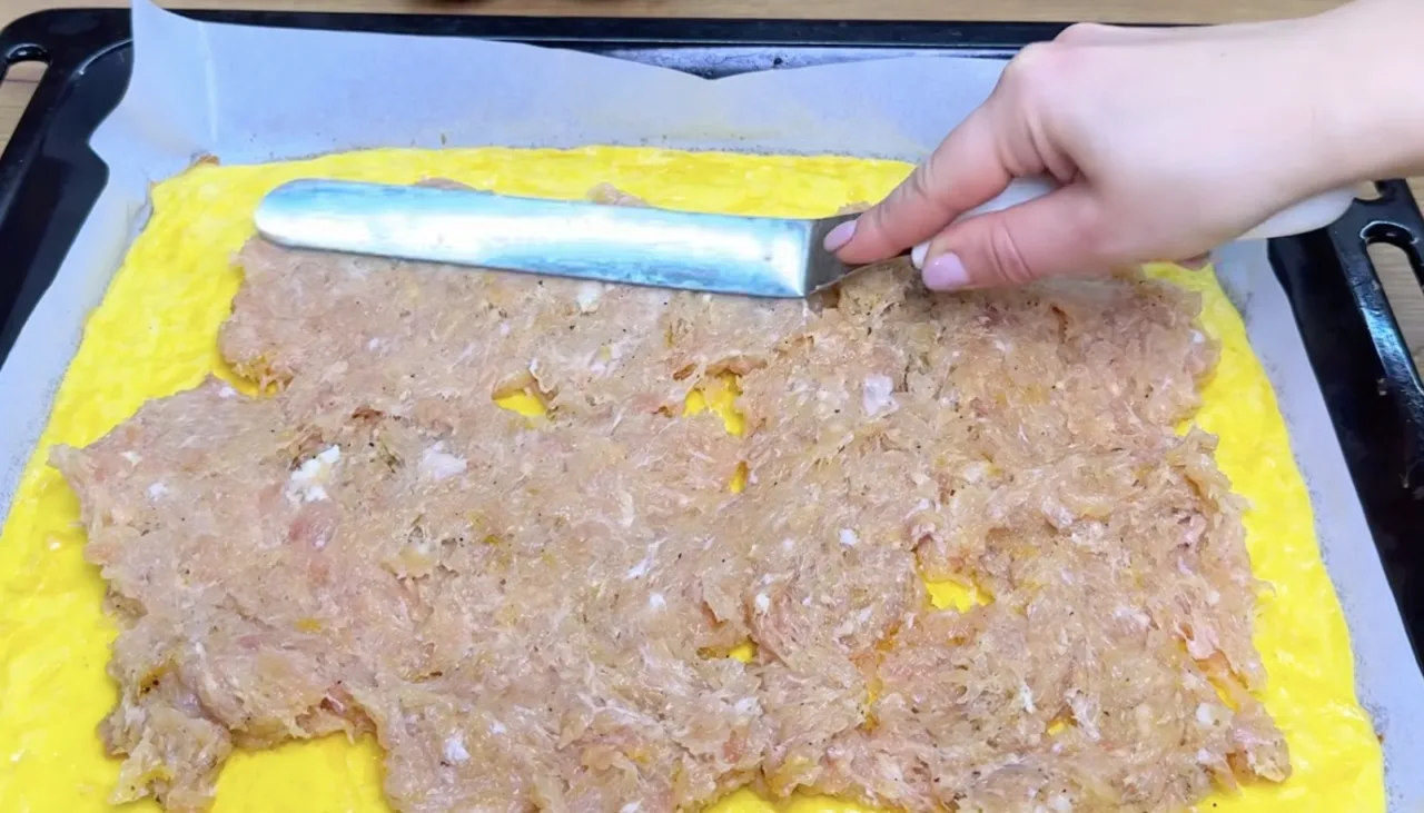 На гарячу сирну основу викладаємо фарш, рівномірно розподіляємо і скручуємо в тугий рулет за допомогою пергаменту.