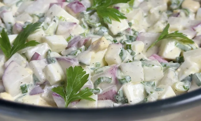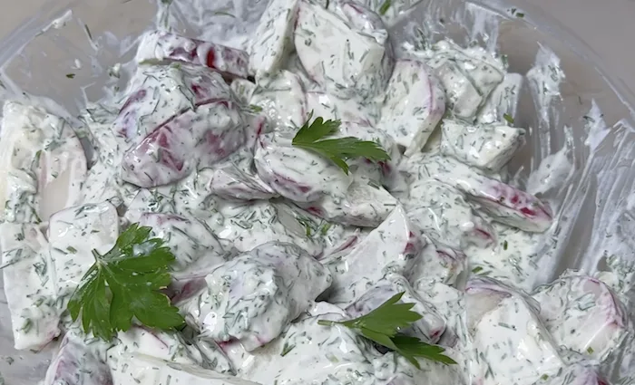 Цей салат виходить ніжним і ситним. Яйця додають кремової текстури, а редиска — свіжості та легкої пікантності. Ідеальний варіант для швидкого обіду або вечері.