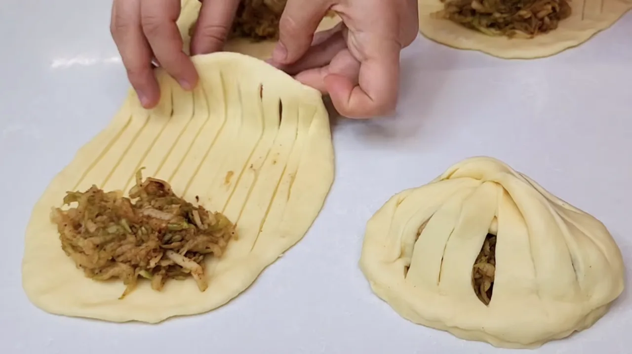 Тісто ділю на 8 частин. Кожну частину формую руками, викладаю начинку і загортаю.