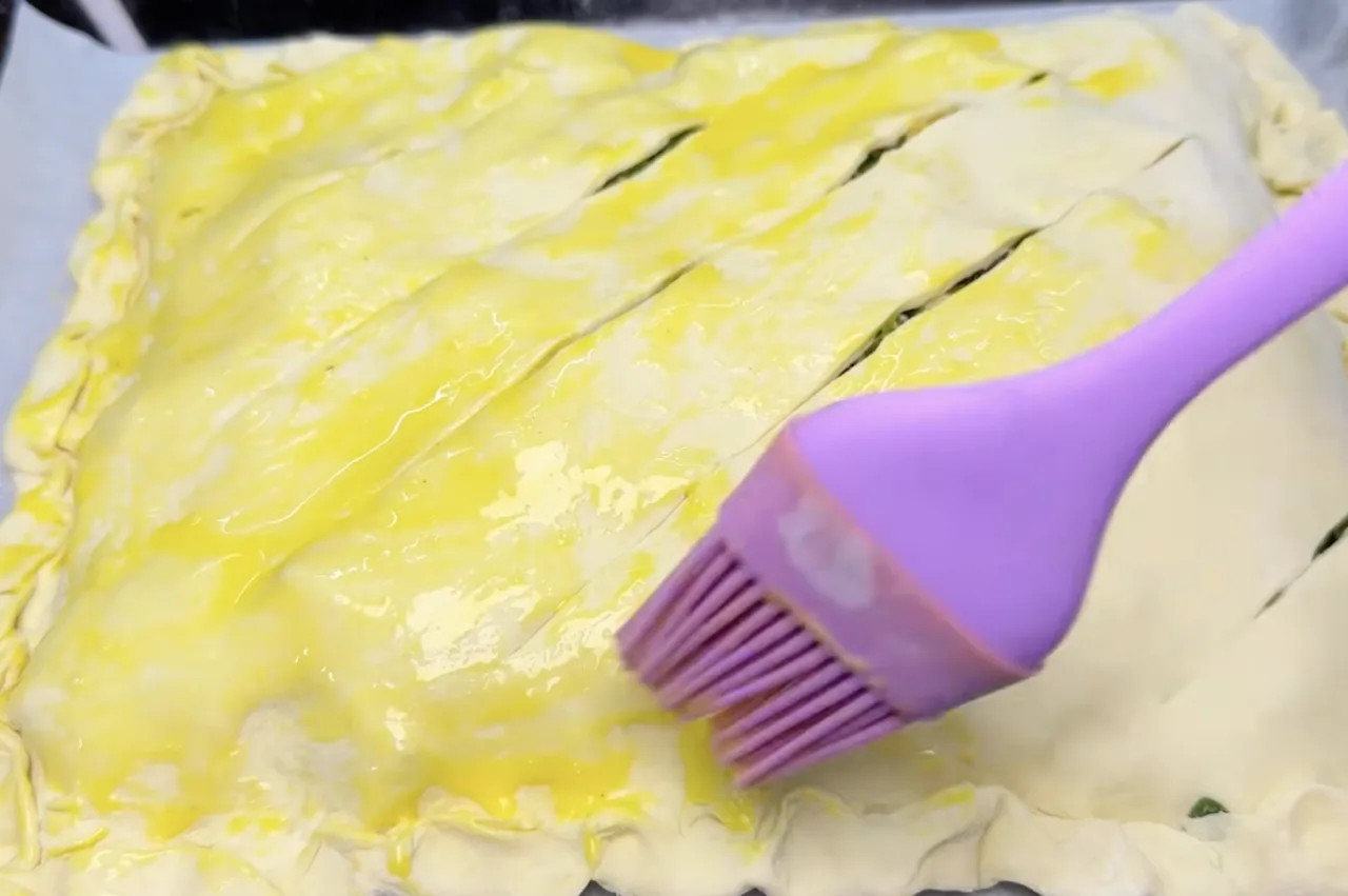 На деко, застелене пергаментом, викладаю один лист тіста. Рівномірно розподіляю начинку, залишаючи краї по 2 см. Накриваю другим листом тіста і добре защипую краї.