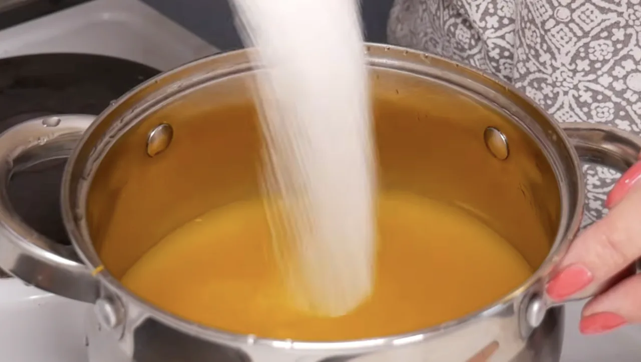 Після варіння даю відвару трохи настоятися. Потім проціджую його через марлю і добре віджимаю, щоб отримати максимально насичену основу. Додаю цукор і знову ставлю на вогонь. Важливо постійно помішувати, щоб він повністю розчинився і не пригорів.
