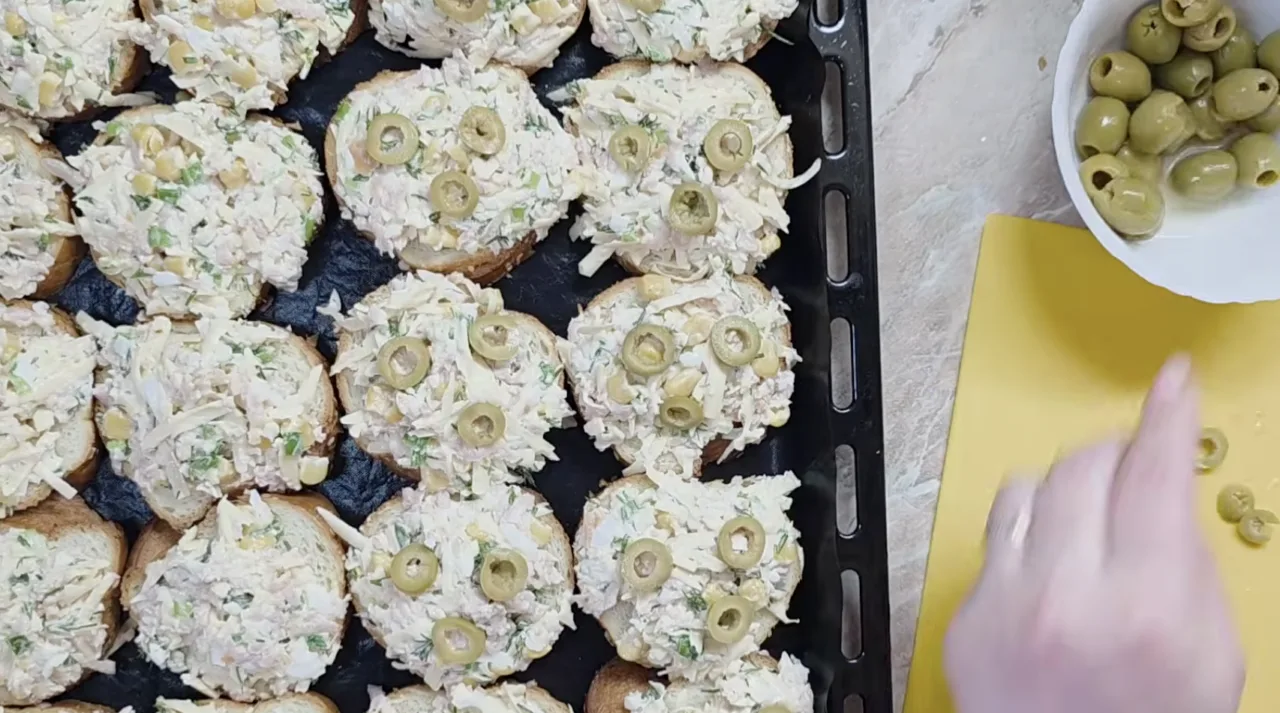 Багет нарізаю скибочками, викладаю на деко. Зверху щедро намазую начинку. Оливки ріжу кружечками і викладаю зверху для пікантності.