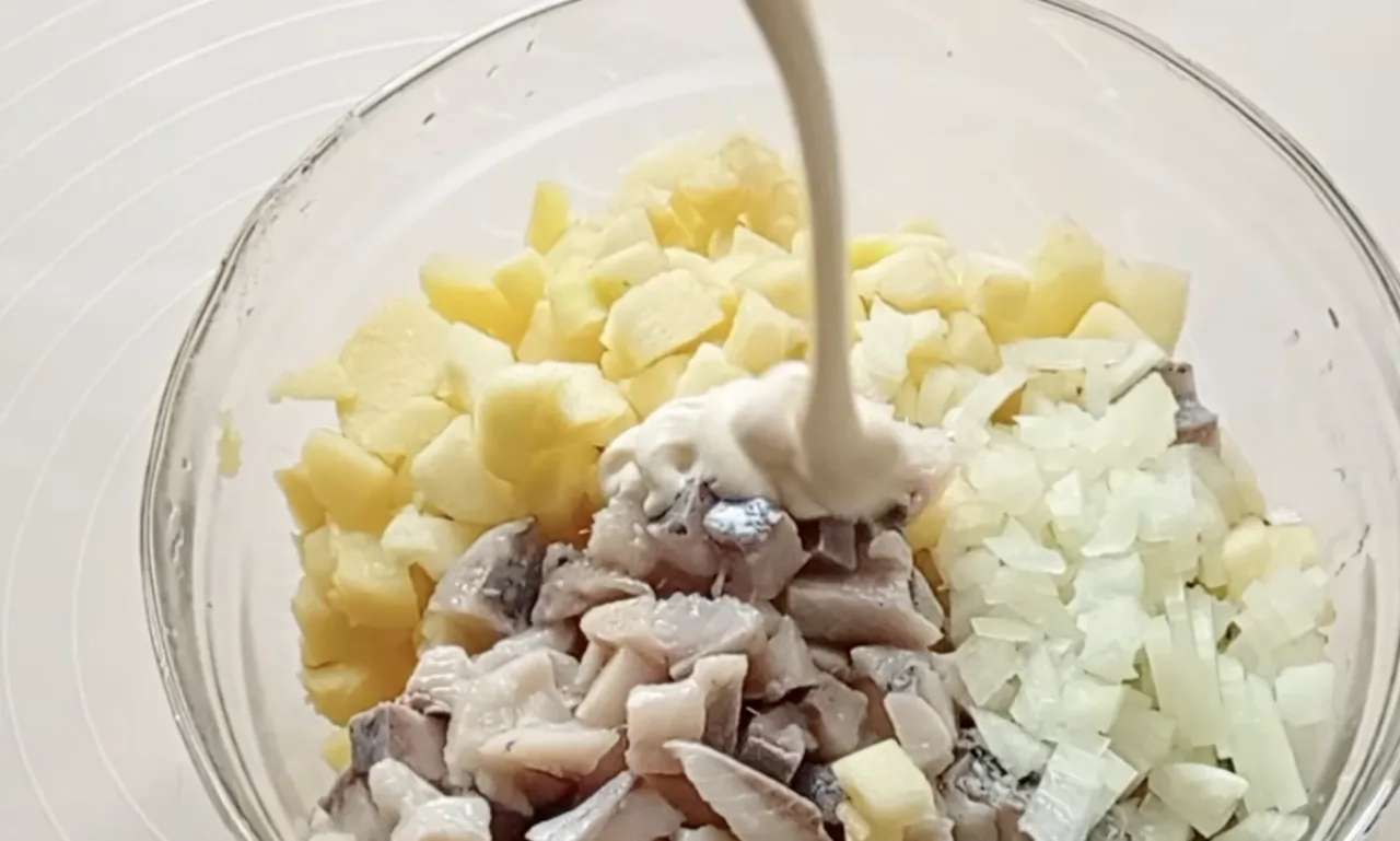 Далі все просто: у великій мисці змішую картоплю, буряк, оселедець, яблуко, огірок і дрібно нарізану цибулю. Додаю сіль, перець і заправляю майонезом. Обережно перемішую, щоб салат залишився апетитним.
