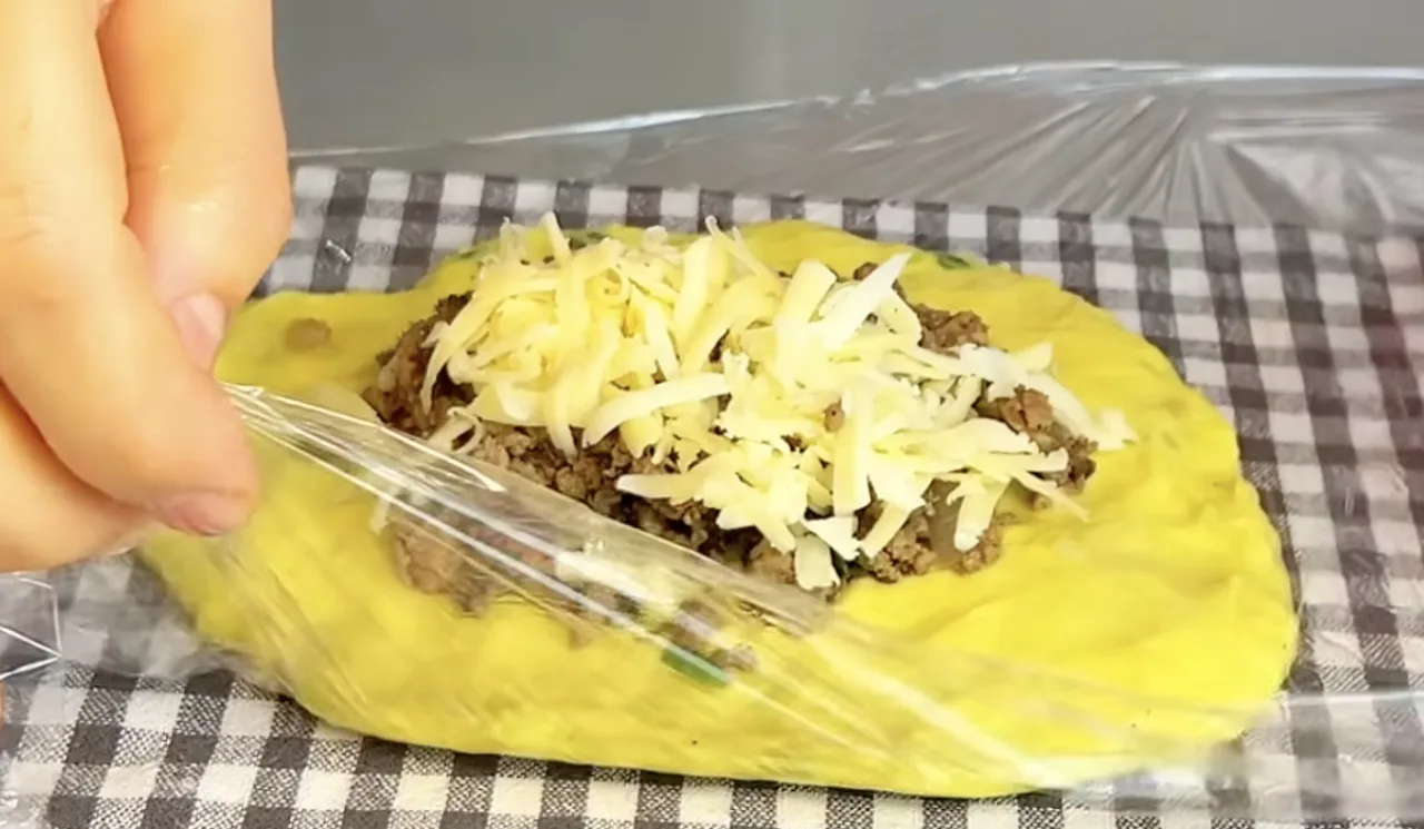 Коли тісто трохи охолоне, формую пиріжки. Роблю це зручно — через плівку або просто руками, злегка змащеними олією. Викладаю тісто, зверху начинку і трохи сиру, формую пиріжок.