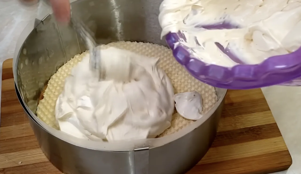 За бажанням у форму можна викласти шар вафельного коржа, потім крем, і знову корж зверху. Або просто викласти всю масу в контейнер. Ставимо в морозильну камеру мінімум на 5 годин до повного застигання.