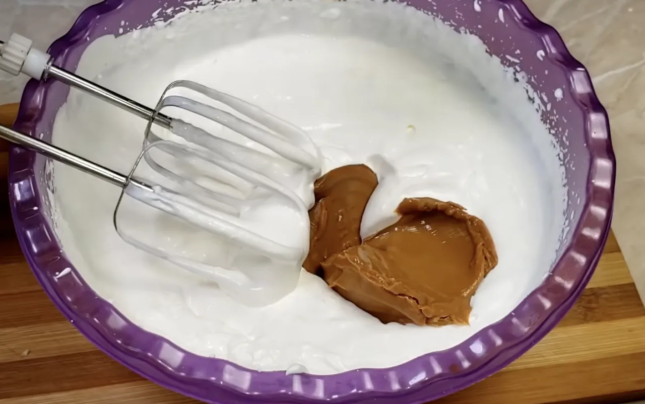 Додаємо варене згущене молоко і ще раз коротко збиваємо — буквально 30–60 секунд, щоб отримати однорідний крем. Важливо не перебити, щоб маса не розшарувалась.