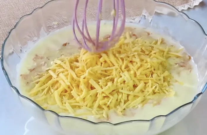 Додаємо решту молока (300 г) і рослинну олію. Перемішуємо. Додаємо шинку та натертий сир.